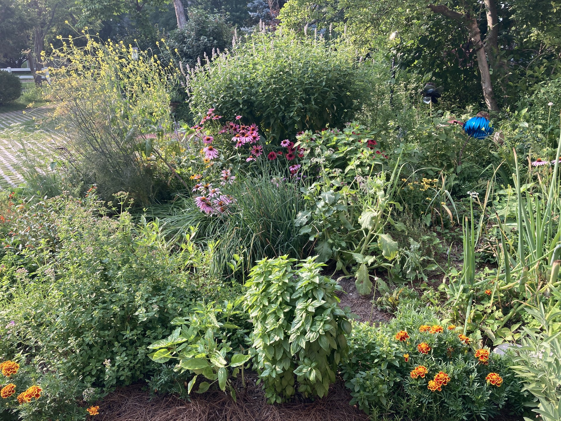 I garden, plant which also includes unintended deer feeding. I've started an orchard with an 8 foot fence that is now 2 years old. I've not tilled the soil and keep adding leaves and more with the intention of sowing native wildflowers between the sort of rows. Doing with my son-in-law - he has bees and we hope to have fruit in a year or two, about the time I retire. I live in Maumee Ohio 8 miles from southern Michigan border, 15 miles form Lake Erie and 3 blocks from the Mighty, muddy Maumee River. I've been here for 30 years. Both my kids moved to this area as adults, have raised my grands here. My daughter has an amazaing Tearoom 3 blocks from my home! I'm as old as dirt and often dirty. My dad taught me gardening. Pictures: One of my 2 year old rain garden and other of my polinator garden - last year - deer ate it this year.