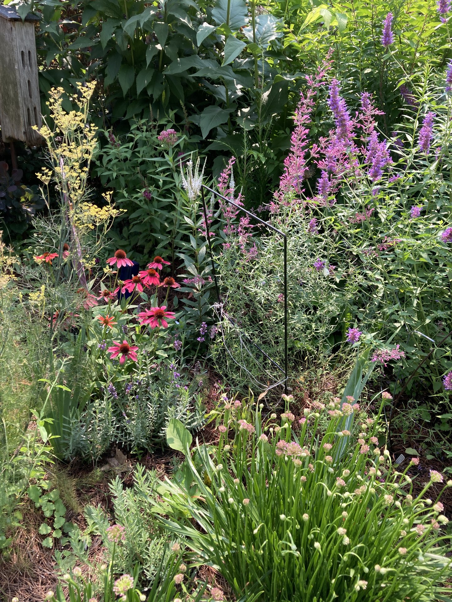 We moved into our house in September 2023. Our front and back yards were planted with mostly native plants by the former owners, and created with biodynamics in mind. There are: elderberry bushes/trees, 4 varieties of apples grafted together and pruned in a topiary style, two plums and a prune tree grafted together, Suffolk and Concord grapevines, blueberries, Oregon grape, a climbing rose, winter and star jasmines, white currant, salal, a Japanese maple style tree, hazelnut, clover back yard, and mason bees. I just planted two camellias this Spring as well.